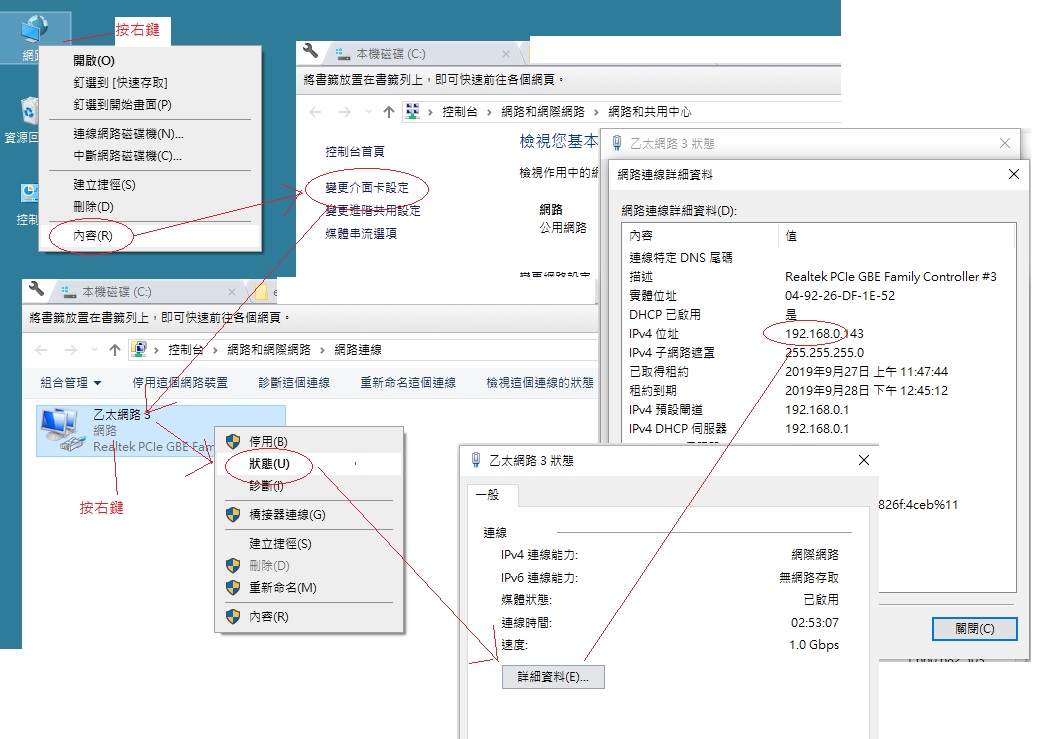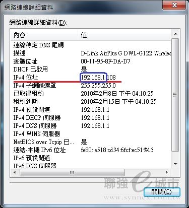 ½ÐÂI¿ï¡uºô¸ô±¶®|«ö¥kÁä¡v¡÷¡u¤º®e¡v¡÷¡uÅܧ󤶱¥d³]©w¡v¡÷¦b¡u°Ï°ì³s½u¡v¹Ï¥Ü¤W«ö·Æ¹«¥kÁä¡A¿ï¡uª¬ºA¡v¡÷¡u¸Ô²Ó¸ê®Æ¡v¤¤¬d¬Ý¡uIPv4¦ì§}¡v«e±¤TӼƦr(¤U¹ÏÂŮسB)¬O§_©MWindows 7¹q¸£Åã¥ÜªºIP¦ì§}«e±¤TӼƦr¤@P¡C
