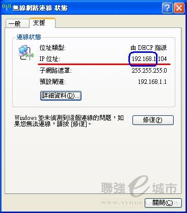 ½ÐÂI¿ï¡u¶}©l¡v¡÷¡u±±¨î¥x¡v¡÷¡uºô¸ô©M¦@¥Î¤¤¤ß¡v¡÷¥ªÃ䪺¡uÅܧ󤶱¥d³]©w¡v¡÷¦b¡u°Ï°ì³s½u¡v¹Ï¥Ü¤W«ö·Æ¹«¥kÁä¡A¿ï¡uª¬ºA¡v¡÷¡u¸Ô²Ó¸ê®Æ¡v¤¤¬d¬Ý¡uIPv4¦ì§}¡v«e±¤TӼƦr(¤U¹ÏÂŮسB)¬O§_©MWindows XP¹q¸£Åã¥ÜªºIP¦ì§}«e±¤TӼƦr¤@P¡C