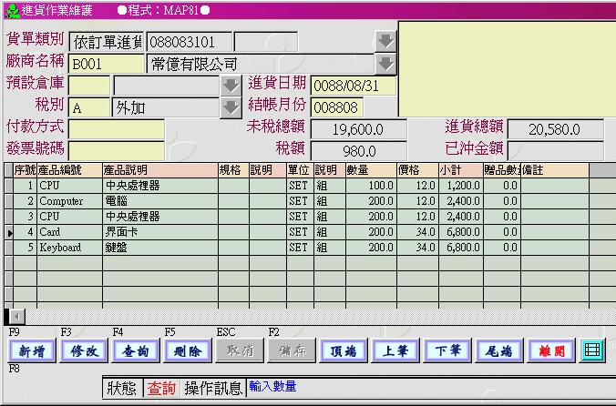 你可以按 F4 鍵查詢,或用滑鼠按 [查詢] 鍵新增資料