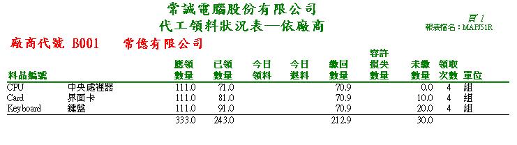 ==== 代工領料狀況表 ====